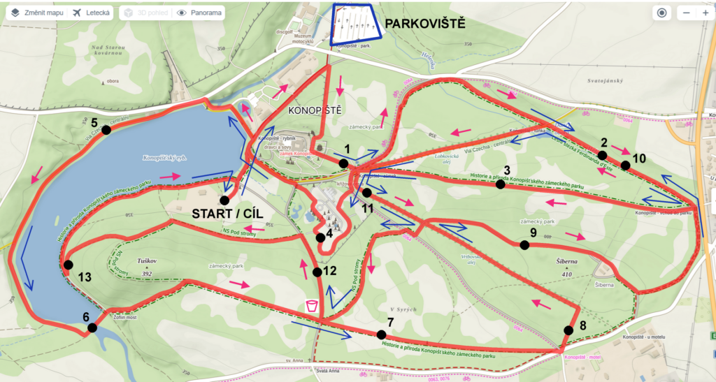 • trasy vedou po zpevněných i nezpevněných cestách, po loukách a pěšinách, částečně také po asfaltových silničkách (s omezeným provozem) krásným zámeckým parkem Konopiště